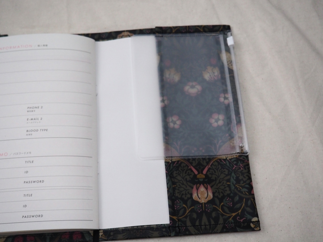 見開き右側は、ジッパー式の袋が付いているので、書類紛失予防になります。
